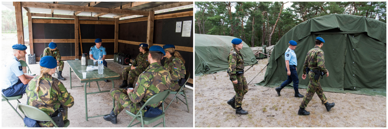 De gesprekken gingen over de oefening, de opleiding en COVID-19. We hebben onder meer uitgelegd hoe we de coronamaatregelen op het terrein respecteerden. Zo stond overal een desinfecterend middel en sliepen we met minder mensen dan normaal in de boogtenten. En in plaats van mensen daadwerkelijk te fouilleren en arresteren, gebruikten we een codewoord, in verband met de 1,5 meter afstand. We letten goed op, daardoor kon gelukkig praktisch alles doorgaan.