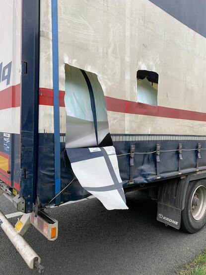 Het gat in het zeil, waardoor de inklimmers de vrachtwagen verlieten.