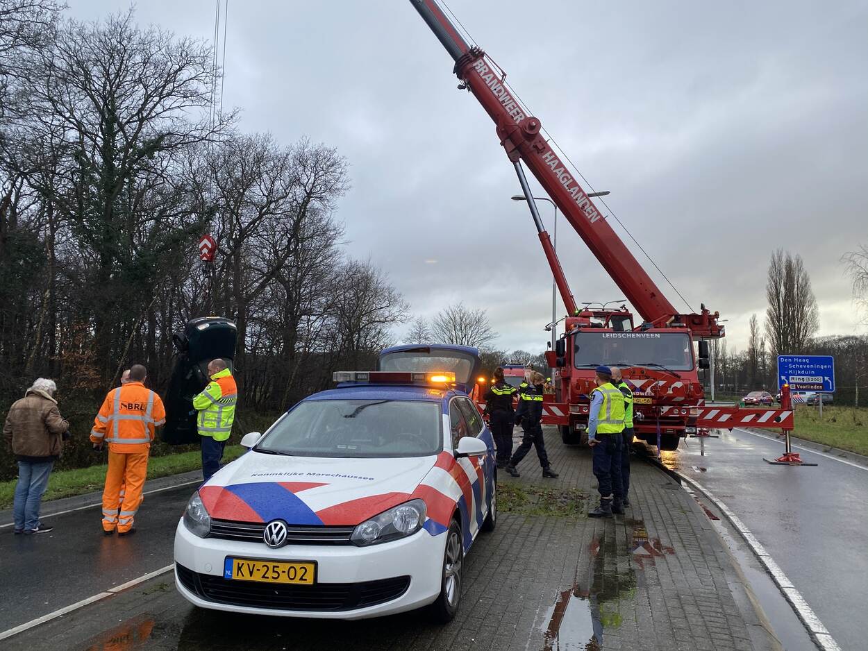 Nadat de vrouw met de ambulance was vertrokken, werd haar voertuig uit het water getakeld. (Foto ANP)
