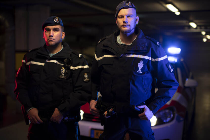 Wachtmeesters Joey (links) en Bart van de brigade Objectbeveiliging stuitten tijdens het uitvoeren van dynamisch toezicht per toeval op het ongeluk.