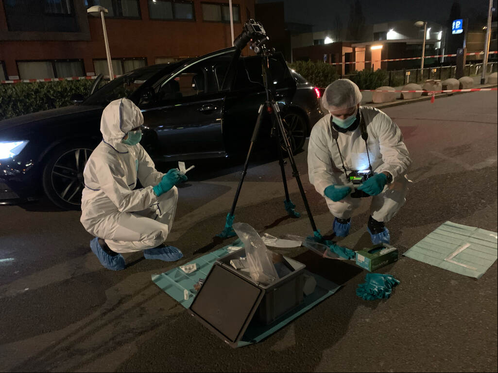 Medewerkers van de Forensische Opsporing van de KMar doen onderzoek op een plaats delict bij Eindhoven Airport. Eerder die dag werd voor de deur van de luchthaven een taxichauffeur neergestoken bij een taxistandplaats. Na een korte achtervolging werd een Poolse man aangehouden als verdachte.