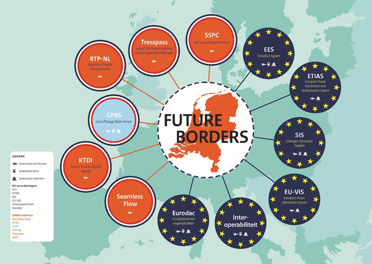 Deze ontwikkeling naar de grens van de toekomst valt in het programma samen met de implementatie van 6 Europese grensverordeningen. Alle Schengenlanden voeren deze in om de digitale samenwerking van de lidstaten binnen het grensproces te verbeteren en de veiligheid en mobiliteit van het grensproces te kunnen borgen. Nu en in de toekomst.