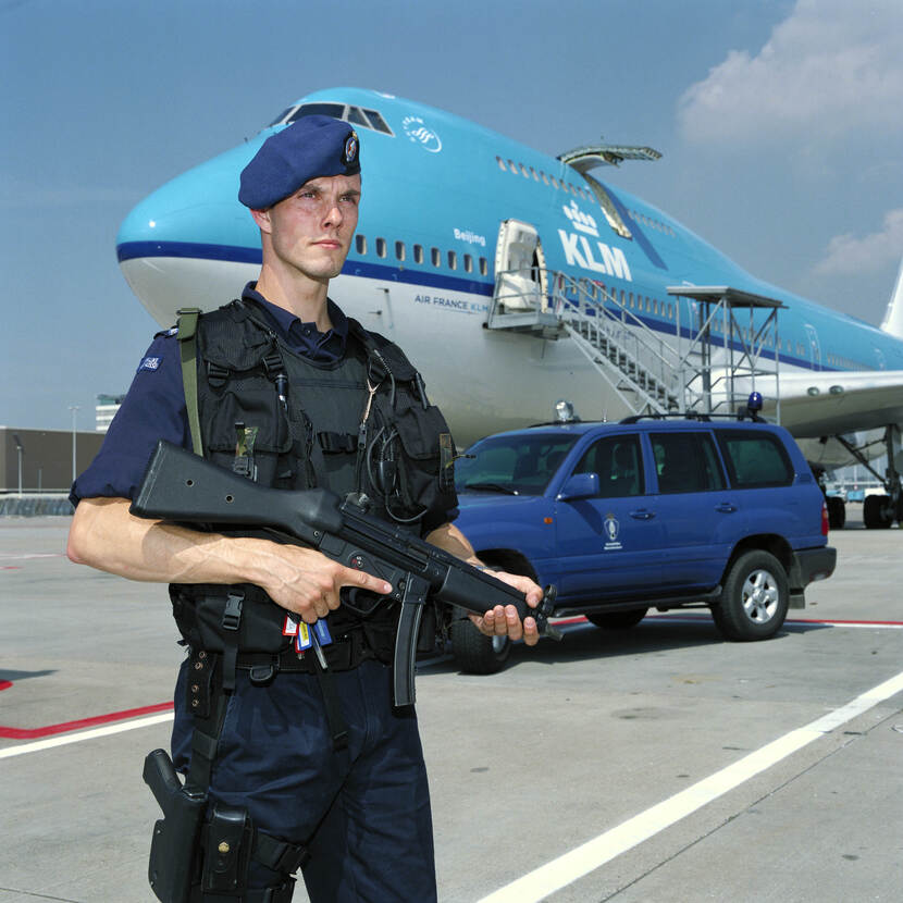 Een operator van de afdeling Hoog Risico Beveiliging beveiligt een vliegtuig van de KLM, begin jaren 2000.