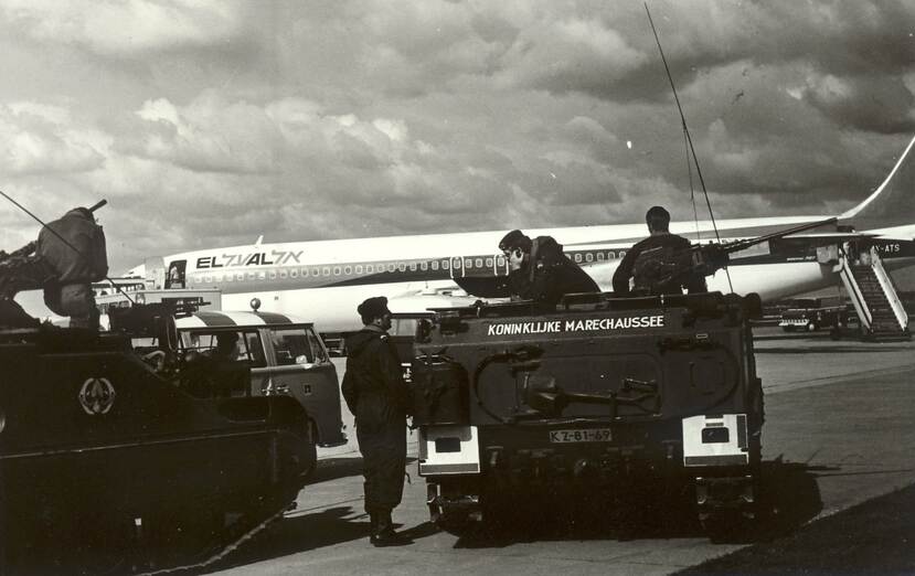 De Koninklijke Marechaussee levert met pantserwagens bijstand bij de beveiliging van El Al, midden jaren 70. Foto: Stichting Museum der Koninklijke Marechaussee.