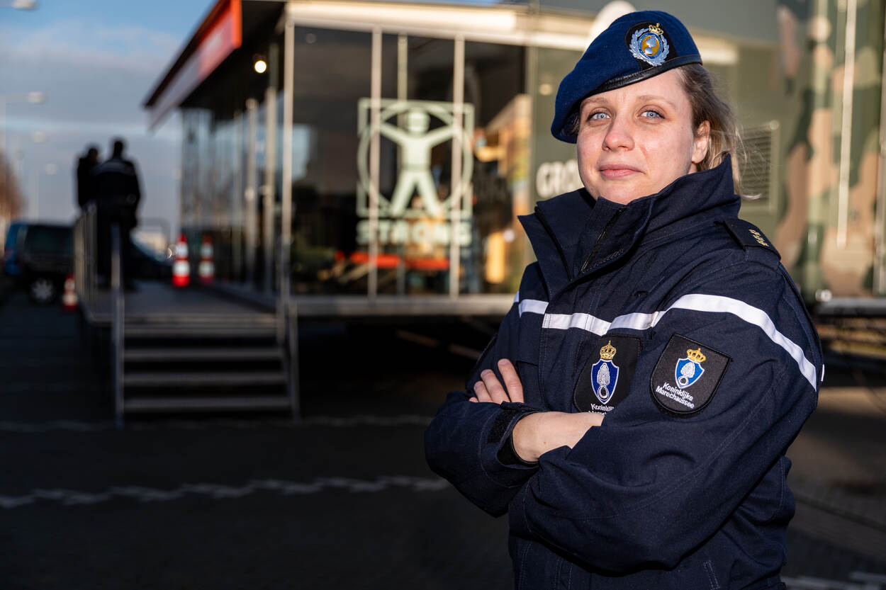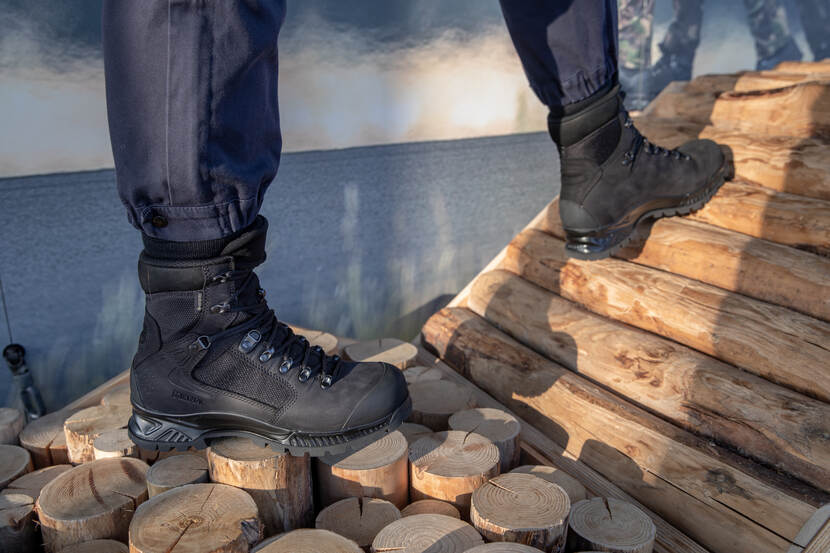 Nieuwsgierig stapt een marechaussee de pasbus in op de Koningin Máximakazerne bij Schiphol. “Ziet er goed uit”, knikt hij goedkeurend bij het zien van de nieuwe dienstlaarzen. “De pasvorm en het draagcomfort staan vanzelfsprekend op de eerste plaats, maar de beleving speelt ook een rol bij de keuze voor de nieuwe laarzen”, zegt reservist-podotherapeut kapitein Jenneke Blom-Schilder.