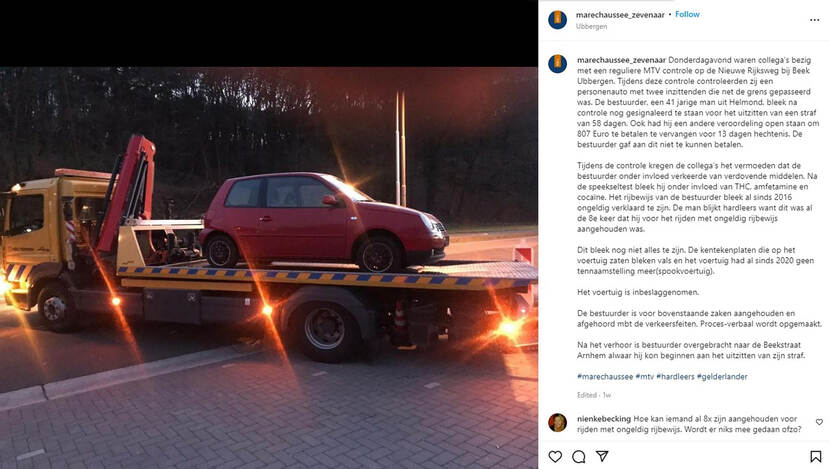 Brigade Zevenaar:Collega’s waren bezig met een reguliere MTV-controle op de Nieuwe Rijksweg bij Beek Ubbergen. Tijdens deze controle controleerden zij een personenauto met 2 inzittenden die net de grens gepasseerd was. De bestuurder, een 41-jarige man uit Helmond, bleek na controle nog gesignaleerd te staan voor het uitzitten van een straf van 58 dagen. Ook had hij een andere veroordeling open staan om € 807,- te betalen te vervangen voor 13 dagen hechtenis. De bestuurder gaf aan niet te kunnen betalen. Tijdens de controle kregen de collega’s het vermoeden dat de bestuurder onder invloed verkeerde van verdovende middelen. Na de speekseltest bleek hij onder invloed van THC, amfetamine en cocaïne. Ook bleek het rijbewijs van de bestuurder al sinds 2016 ongeldig verklaard te zijn. De man blijkt hardleers want dit was al de 8e keer dat hij voor het rijden met ongeldig rijbewijs aangehouden was. Dit bleek nog niet alles te zijn. De kentekenplaten die op het voertuig zaten bleken vals en het voertuig had al sinds 2020 geen tenaamstelling meer (spookvoertuig). Het voertuig is inbeslaggenomen."