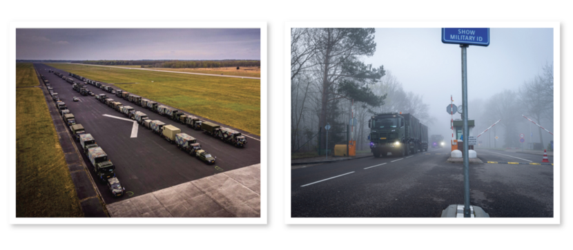 In april stonden 99 voertuigen, 55 aanhangers en 150 militairen op de kazerne in het Limburgse Vredepeel klaar voor vertrek.
