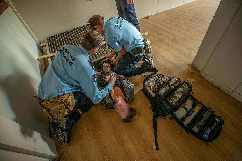 Tijdens de integratie-oefening trainen marechaussees de verzorging van een gewond geraakte collega.