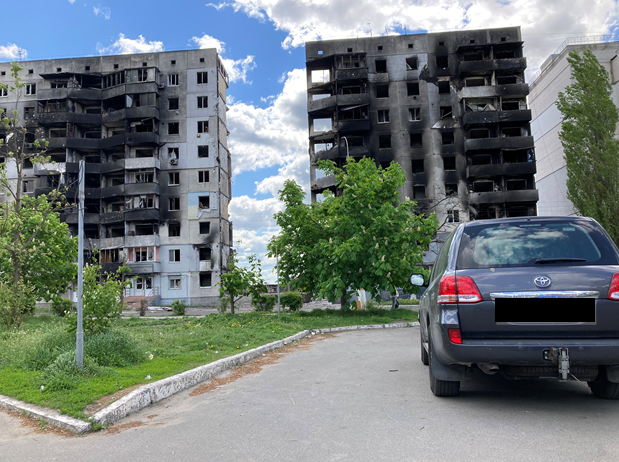 Onderweg zagen de teamleden kapotte gebouwen en kraters in wegen (archieffoto eerste FO-missie naar Oekraïne).