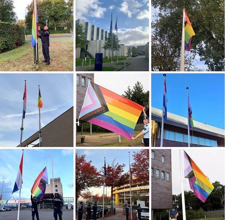 Kleurrijke nieuwe Progress-vlaggen sierden op 11 oktober, op coming out-dag, de toppen van de vlaggenmasten van de marechausseebrigades en het Opleidings-, Trainings- en Kenniscentrum KMar. Met het hijsen van de vlag laat de KMar zien dat iedereen welkom is in de organisatie en het hele jaar zichzelf mag zijn.