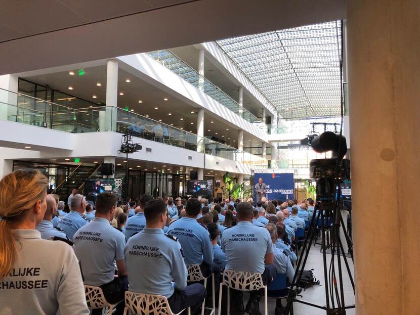Presentator Rens de Jong en Commandant Koninklijke Marechaussee, luitenant-generaal Hans Leijtens, ontvingen meerdere gasten op het podium. Samen gingen ze het gesprek aan, onder meer over de Defensienota, de inzet in Oekraïne en het nieuw op te richten eskadron voor Militaire Politietaken.