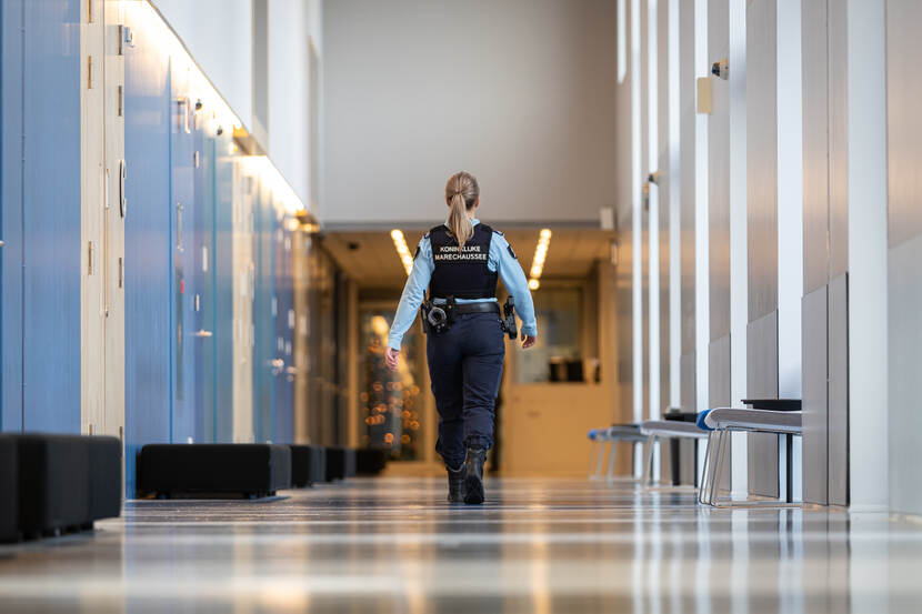 “Normaal gesproken houd ik me als marechausseebeveiliger op zittingsdagen vooral bezig met de verdachte(n). Dat kunnen verdachten zijn van delicten op Schiphol of van zware misdrijven, zoals liquidaties of terrorisme. De verdachten worden op het JCS binnengebracht en daar in een cellencomplex geplaatst. Als ze uit een zwaarbeveiligd complex komen, zijn ze vaak al gefouilleerd. En anders fouilleren we hen zelf, en begeleiden we hen naar de zaal.