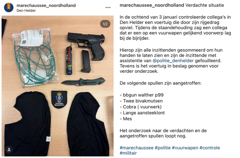 Op verzoek van de Marechaussee ging de politie in Gouda naar zijn woning. Daar werden 3 niet van echt te onderscheiden nepvuurwapens aangetroffen en een wapenstok.