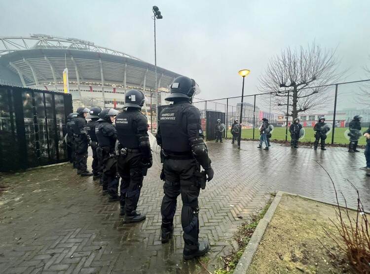De Bijstandseenheid van de Koninklijke Marechaussee heeft op 16 februari de politie ondersteund bij de voetbalwedstrijd Ajax-Union Berlin. De collega’s van de Bijstandseenheid KMar (BE KMar) zijn flexibel inzetbaar en opgeleid om op te treden in zowel het lage als het hoge geweldsspectrum. Indien nodig kan de eenheid ter plaatse zeer snel opschalen. Dat was niet nodig: rond de wedstrijd hebben zich geen grote incidenten voorgedaan.