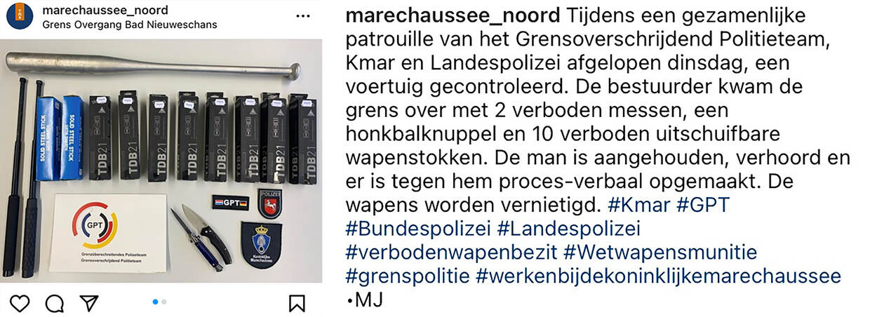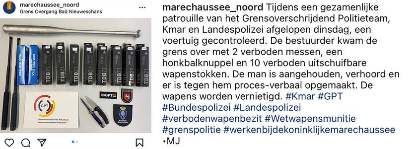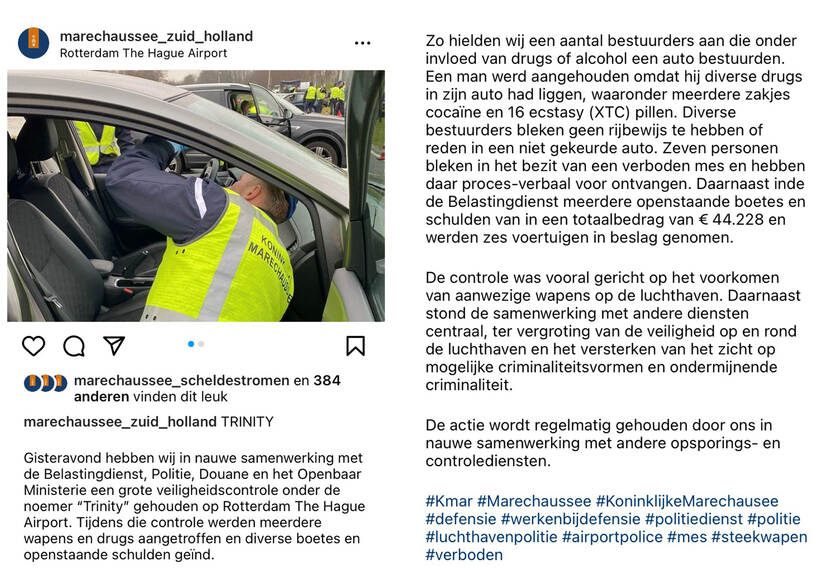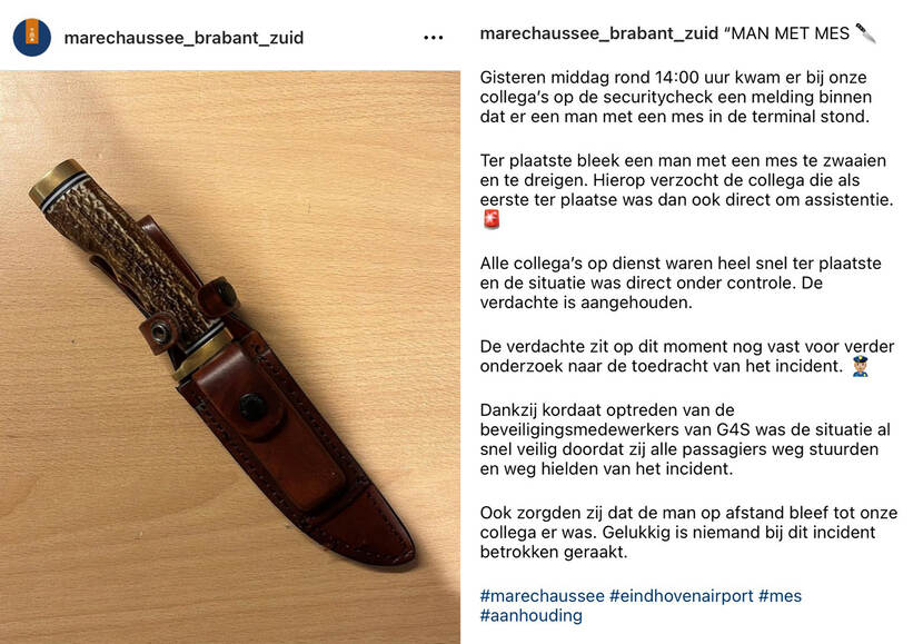 Bij een securitycheck op Schiphol is een mes aangetroffen in de gesp van een riem. De drager van de riem heeft een boete gekregen. Tegen hem is proces-verbaal opgemaakt. De Marechaussee heeft de riem met mes in beslag genomen. De verdachte heeft de boete ter plaatse voldaan, laat de Marechaussee op Schiphol weten via Instagram.