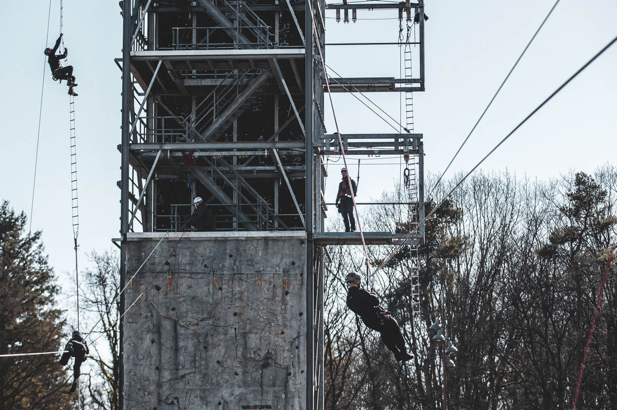 In de ochtend zijn de 12 cursisten (3 vrouwen en 9 mannen) begonnen met een pittige les in het zwembad. Daarna volgde terreinwerk. Nu staan ze onderaan de klimtoren. Gedurende deze oefening moeten de cursisten alles geven, zowel fysiek als mentaal. Oefening Max doet zijn naam zoals altijd eer aan.