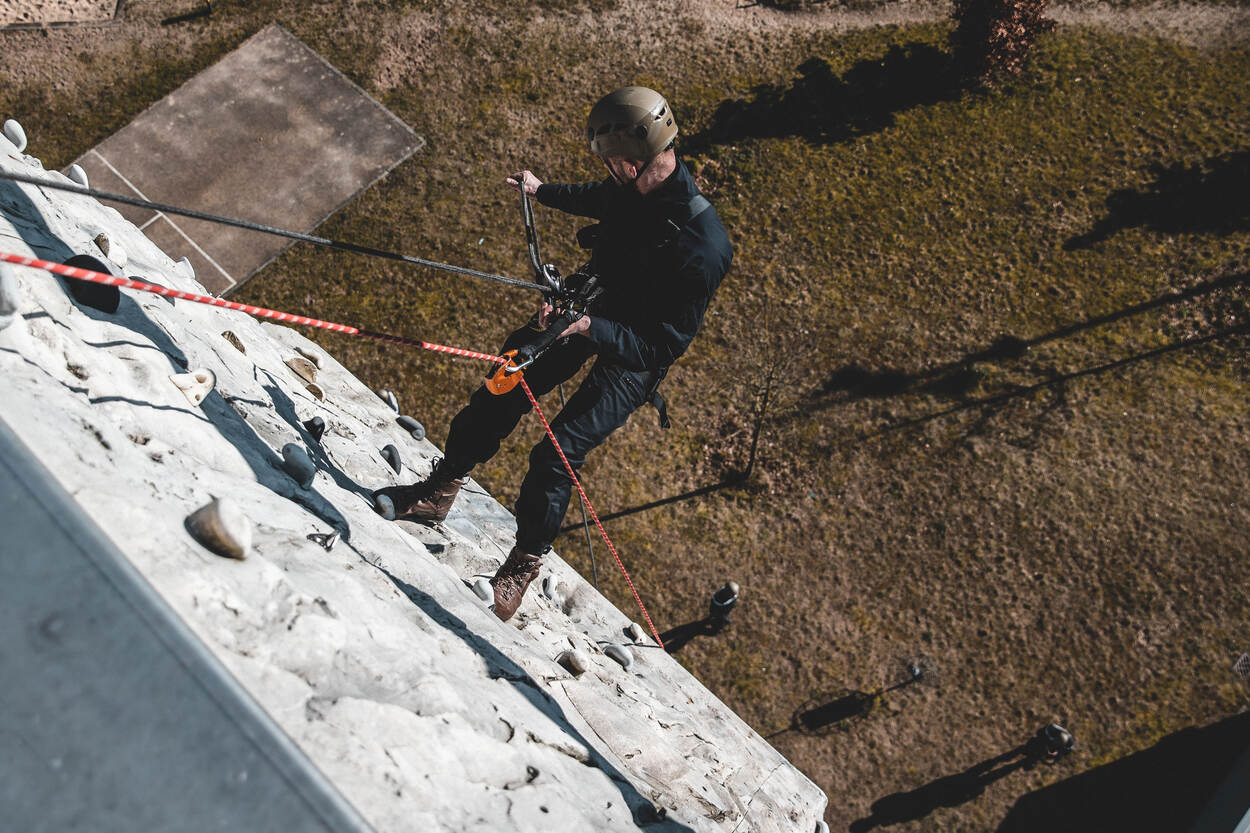 12 BSB’ers in opleiding trotseerden eind vorige maand de klimtoren op het Opleidings-, Trainings- en Kenniscentrum Koninklijke Marechaussee (OTCKMar) in Apeldoorn. Het speciaal voor hen ontwikkelde parcours maakte deel uit van oefening Max.