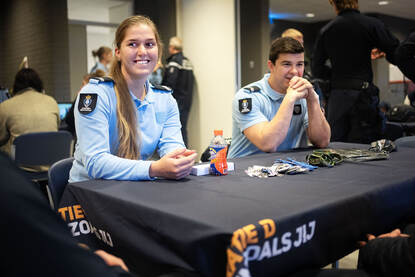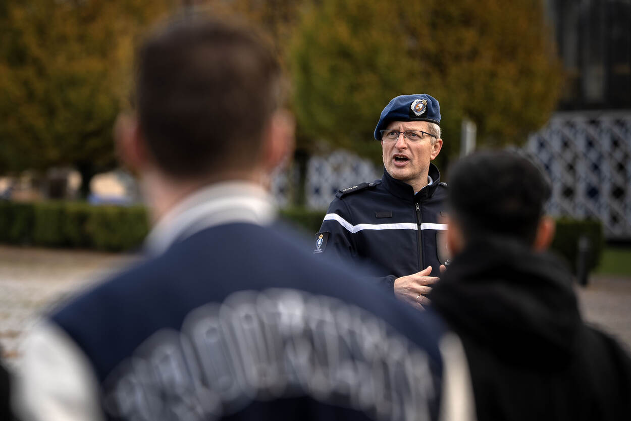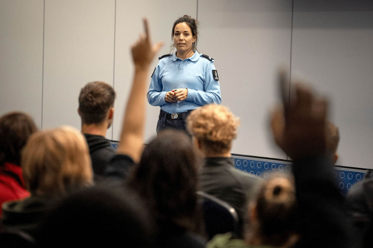 Wachtmeester Marjolein neemt in het auditorium alle tijd voor haar mogelijk nieuwe collega’s. Hun vragen gaan vooral over hoe lang het duurt voordat ze door kunnen groeien en of ze ook mee op uitzending moeten.