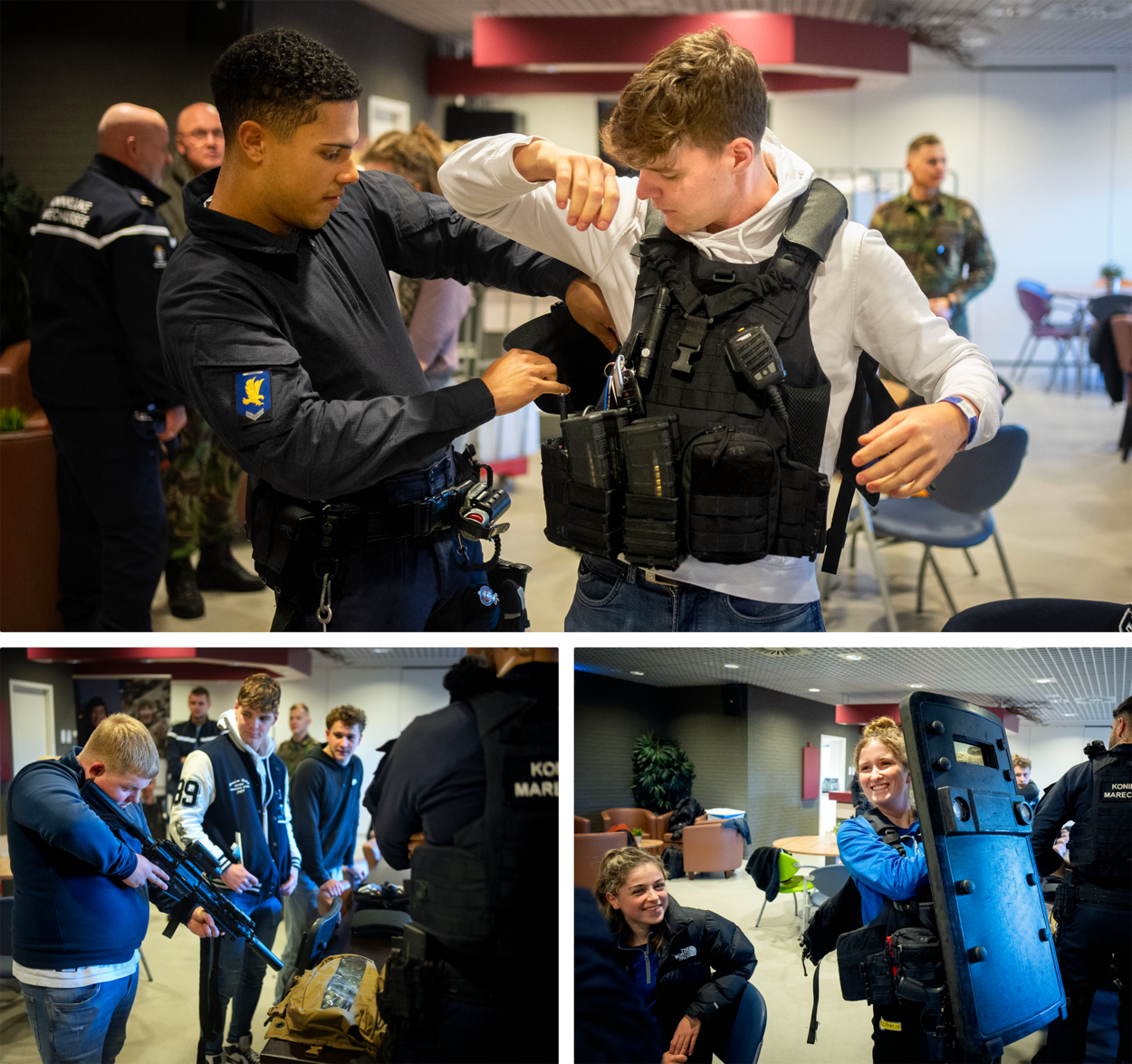 Een collage van deelnemers die kennis maken met het werk van marechausseebeveiliger.