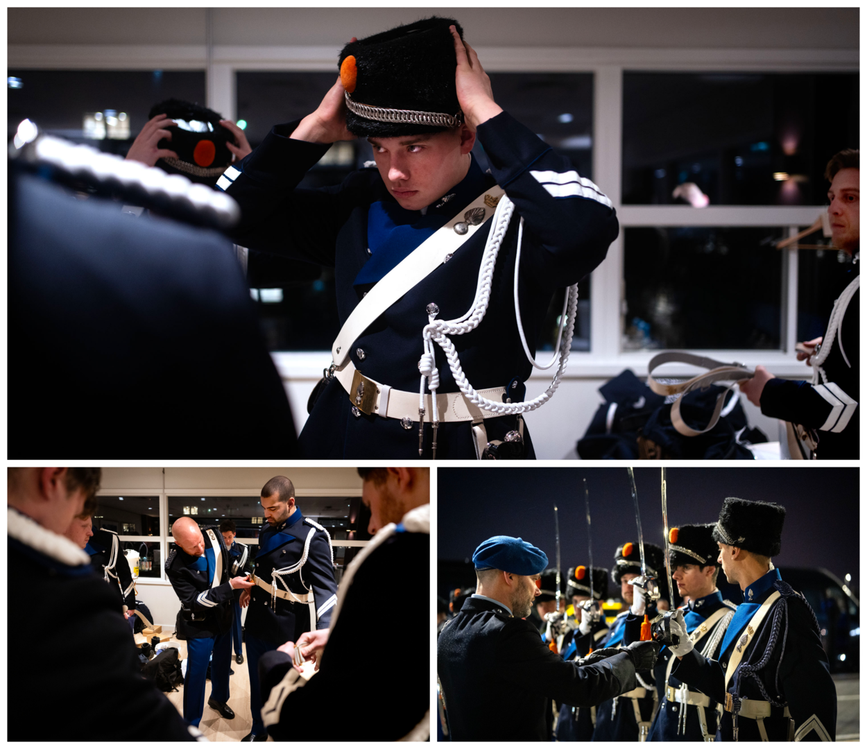 Adjudant Jeroen: “Sinds kort organiseer ik voor nieuwe collega’s een soort introdag. We zijn een onbekende club en onbekend maakt onbemind. Dan leg ik uit wat we doen en we gaan ook de praktijk oefenen, zoals de wisseling van de wacht en exercitie. Maar ook: wat moeten we doen bij een kranslegging? Je denkt: heel simpel, je pakt een krans op en legt hem neer. Maar er zitten heel veel regeltjes aan. Er komt veel druk bij kijken. Iemand die voor het eerst meedoet, geven we een spoedcursus. Iedere marechaussee kan worden opgedragen om ceremoniële taken uit te voeren. Maar wij vragen wel aan elke commandant: wijs 20 mensen aan voor een poule, dan kunnen we kennis en ervaring opbouwen. In de voorbereiding is het vooral heel veel vergaderen.”