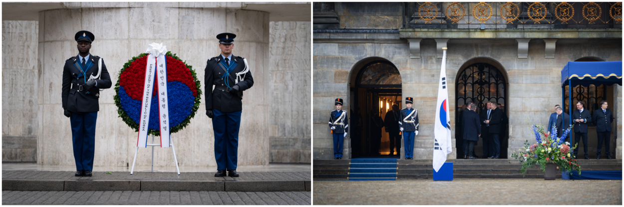 2 dagen duurde het staatsbezoek van de Zuid-Koreaanse president Yoon Suk-yeol en zijn vrouw aan ons land. Samen met koning Willem-Alexander en koningin Máxima legden ze onder meer een krans bij het monument op de Dam, was er een ontmoeting met veteranen en een staatsbanket. Drukke tijden dus voor de Koninklijke Marechaussee, die verantwoordelijk is voor zowel de beveiliging van het Paleis op de Dam als het ceremoniële gedeelte. Wij spreken met 3 collega’s over wat er allemaal komt kijken bij zo’n staatsbezoek.