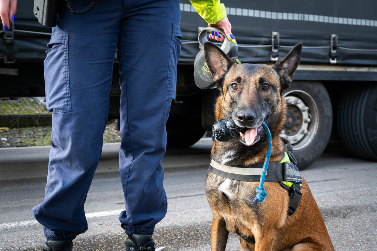 Marlou: “Onze dienst zat er bijna op toen we de laatste 15 van zo’n 400 vrachtwagens controleerden, voordat ze op een schip naar het Verenigd Koninkrijk zouden varen. Toen mijn hond Max en ik langs een van de vrachtwagens liepen, ging hij gelijk ‘af’.”