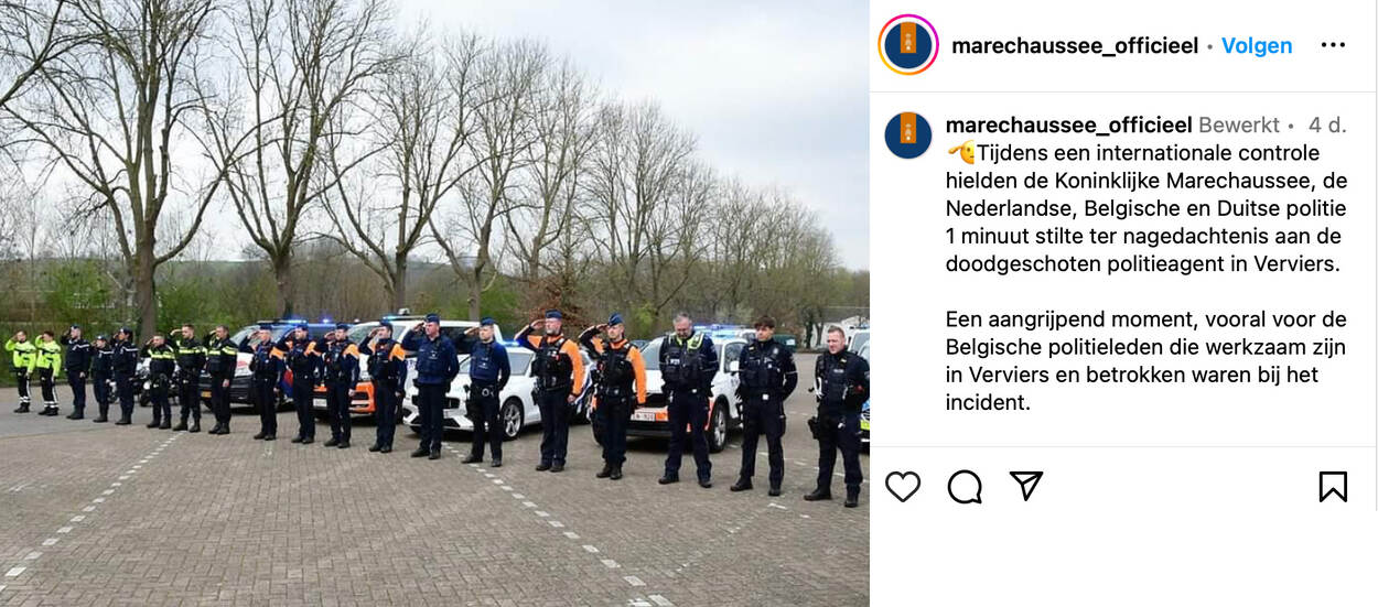 Screenshot van post op Instagram, op foto brengen marechaussees eregroet ter nagedachtenis aan doodgeschoten Belgische collega.