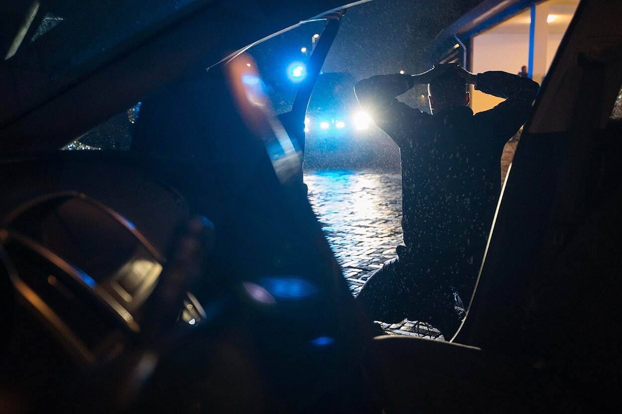 Een arrestant zit in het donker op zijn knieen voor een voertuig tijdens een aanhouding.