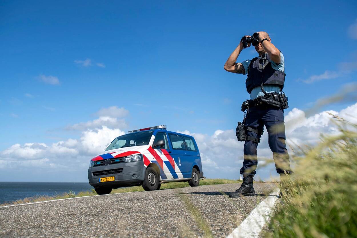 een marechaussee tuurt door een verrekijker, hij staat naast een busje.