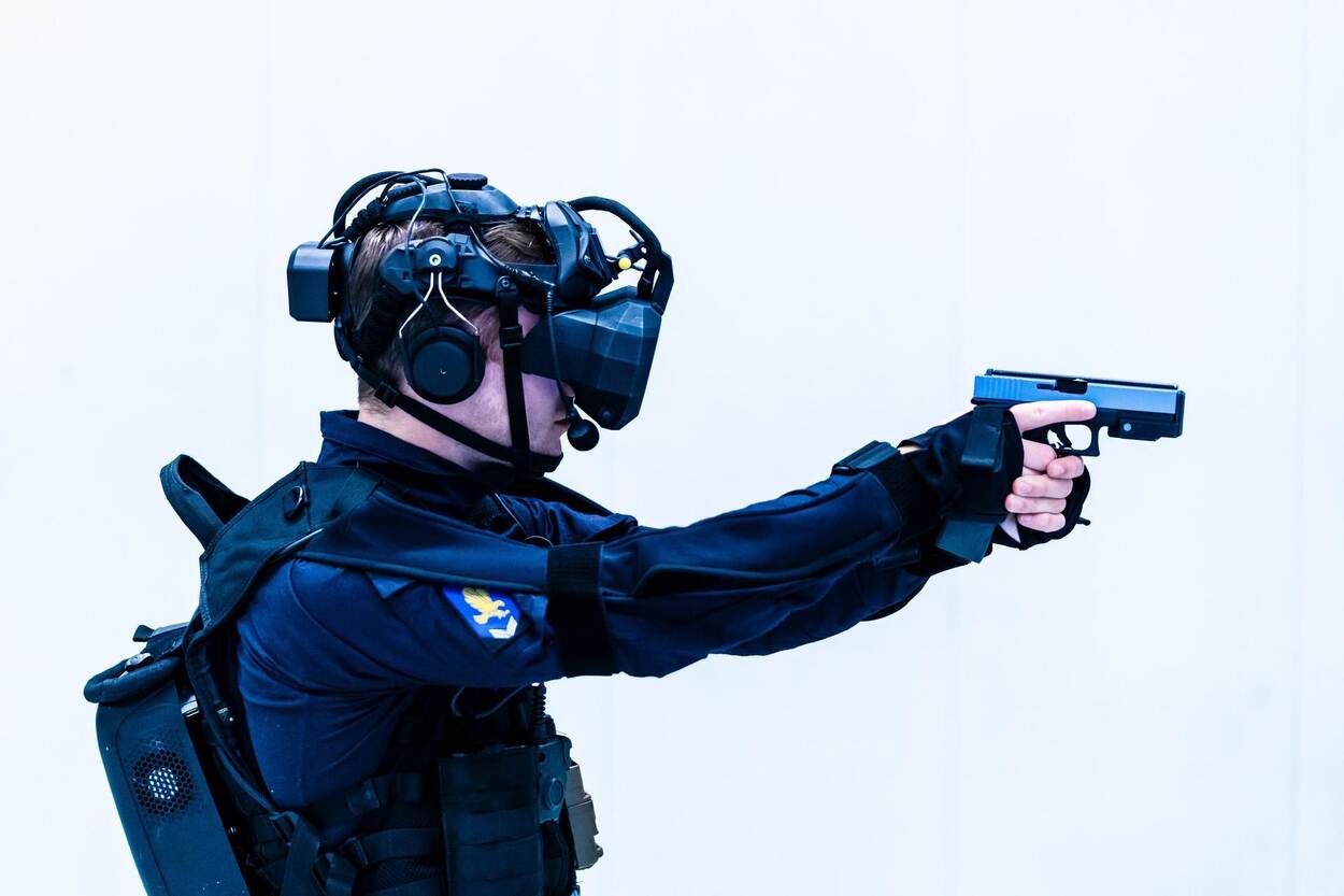 Marechaussee oefent met een Virtual Reality-bril en heeft een pistool getrokken.