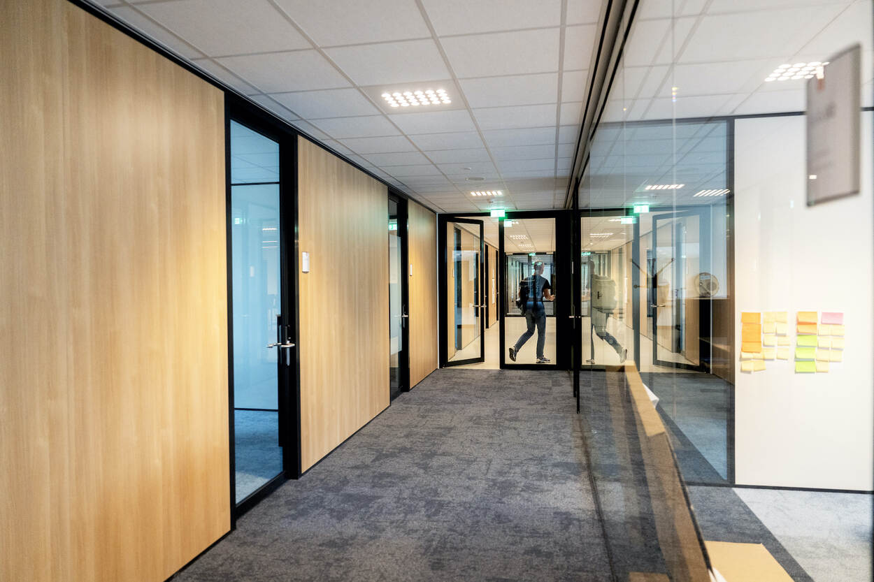 Eén van de gangen in het nieuwe pand. Door de glazen deuren kunnen collega’s elkaar zien. In een van de ruimtes hangen post-its aan de muur.