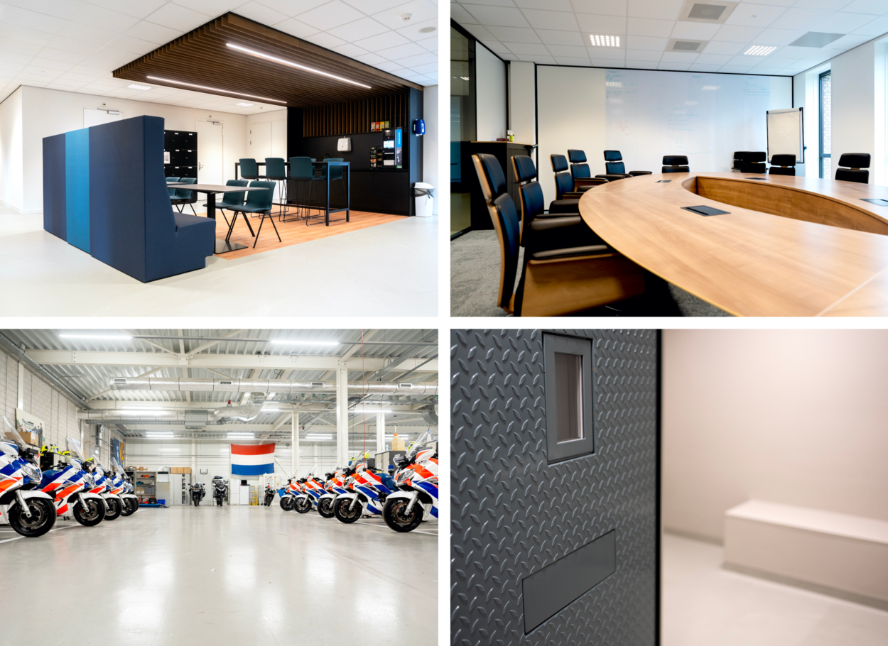 Het nieuwe pand is voorzien van pantries waar collega’s kunnen samenkomen, vergaderzalen, een garage voor de dienstmotoren en een cellencomplex.