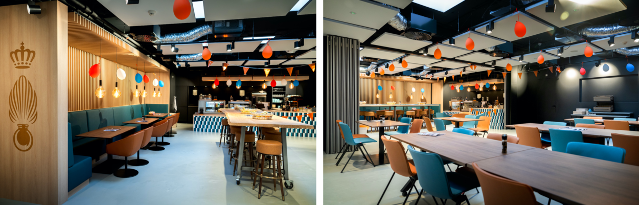 Afbeeldingen van de koffiecorner, waar blauwe en oranje stoelen aan houten tafels staan en mensen aan de wit-groen getegelde toonbank warme broodjes, gekoelde drankjes en bijvoorbeeld koffie kunnen halen.