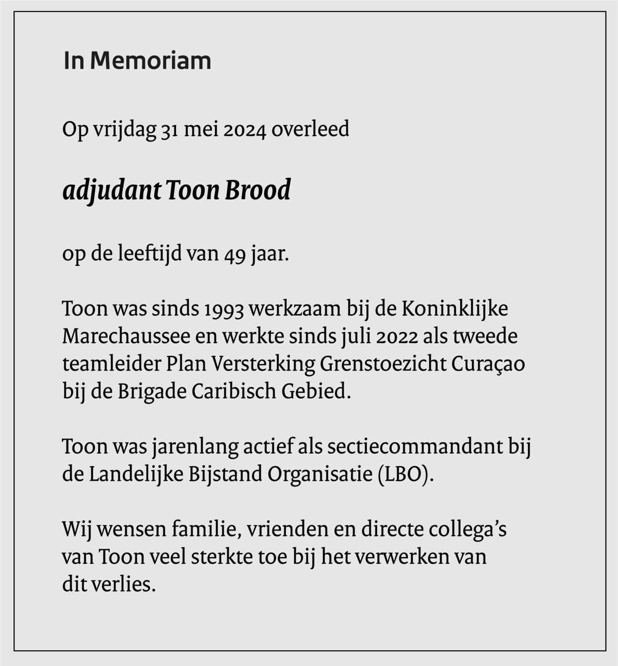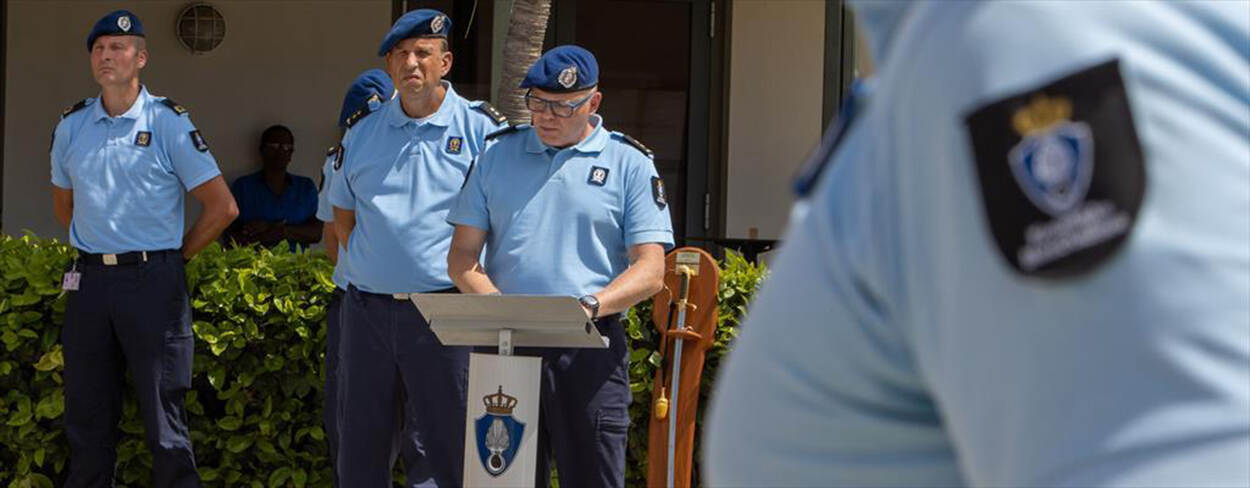 De overdracht op Curaçao was een sobere plechtigheid in het bijzijn van collega’s, familie en de commandant van het Landelijk Tactisch Commando, brigadegeneraal, Jos Pieters.