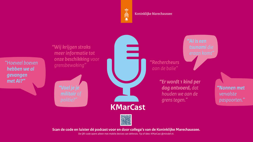 De eerste aflevering van KMarCast is live! De interne podcast voor en door collega’s van de Marechaussee gaat over onderwerpen die leven in de organisatie. Marechaussee-1 Priscilla Batten en opperwachtmeester Jasper Snippe praten in deze aflevering met de host, luitenant-kolonel Koen Polak, over de ontwikkelingen op de grens. Over kindontvoeringen, digitalisering en als grootste vraag; ‘zijn we straks nog wel nodig op de grens?’.