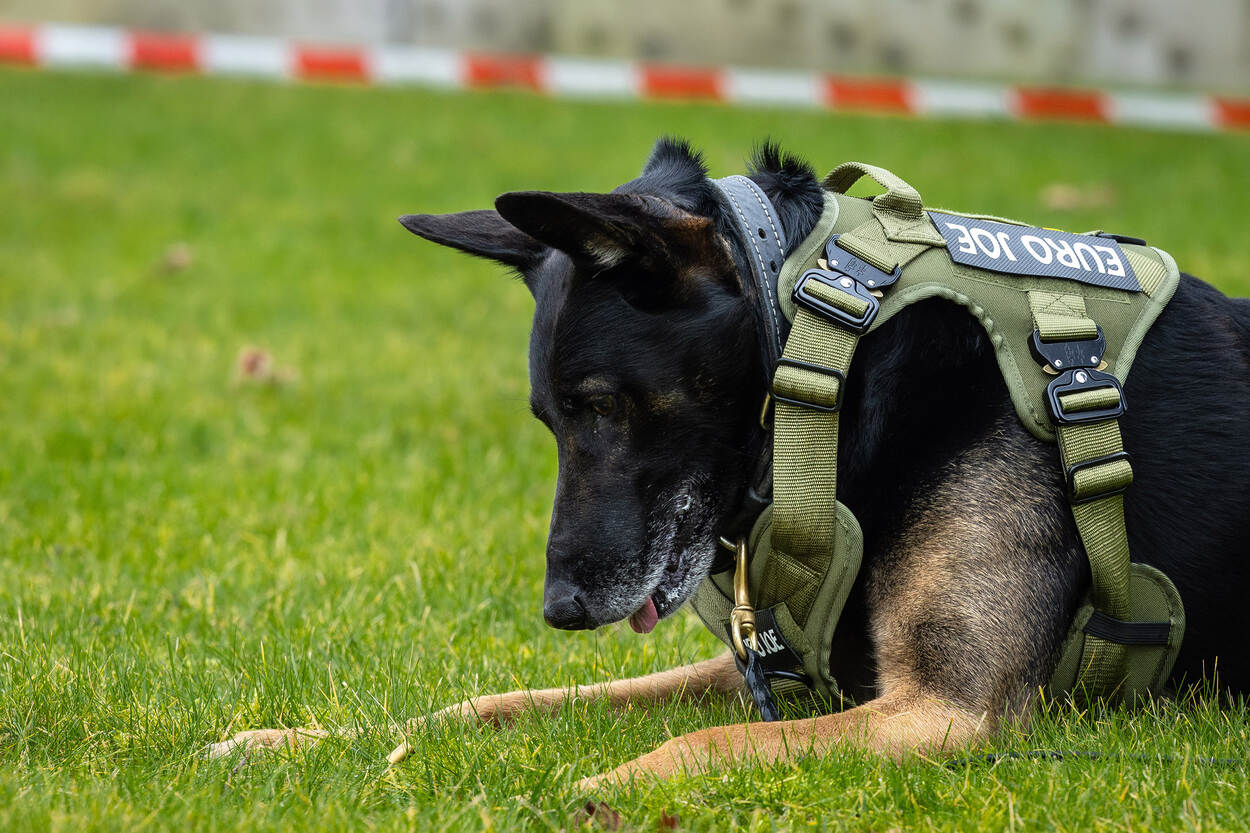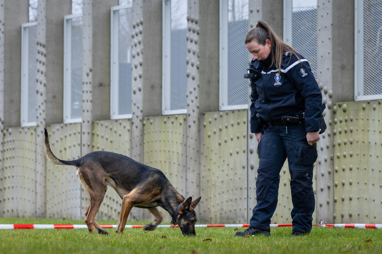 Bingo? Bingo! Het valt misschien niet op, maar de pose die Mack hier aanneemt, geeft een vondst weer. Kijk maar eens goed naar wat er tussen zijn pootjes ligt. Juist ja: een huls. “We trainen de honden zo dat ze bij het object gaan liggen als ze iets vinden waar ze op aansloegen. Belangrijk is dat ze er niet aan zitten met hun poten of dat ze erop kauwen of bijten”, vertelt Edwin. “Het zou zomaar een explosief kunnen zijn; dat is erg gevaarlijk. Tegelijkertijd voorkomen we zo dat er bewijsmateriaal zoals vingerafdrukken van een verdachte verloren gaat.”