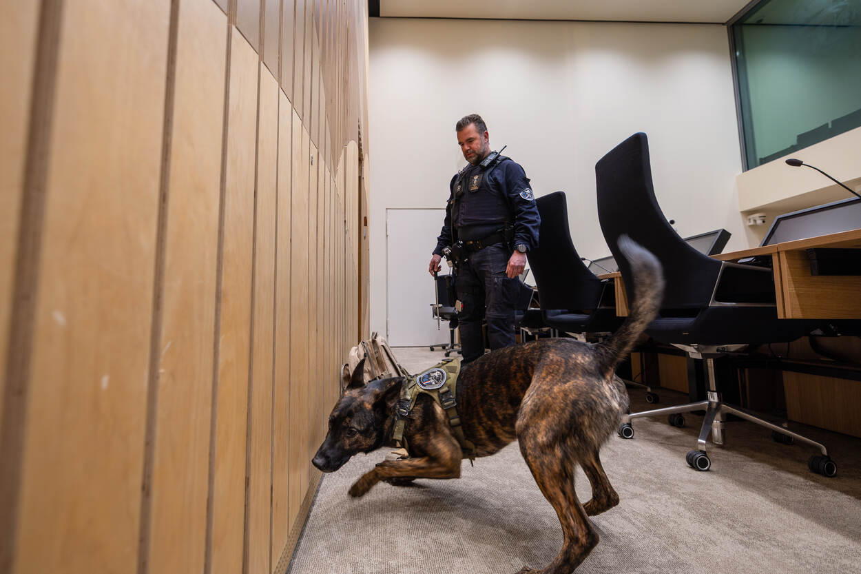 De verdachte is opgepakt en de omgeving lijkt op het eerste oog veilig. Wat deed die onbekende man in zittingszaal D? Wilde hij een (moord)aanslag plegen? Heeft hij misschien een explosief verstopt? Om er zeker van te zijn dat ook deze ruimte veilig is, komen speurhondenteams in actie. Speurhond Mack en zijn geleider opperwachtmeester Tom zijn klaar om de ruimte te ‘clearen’, zoals dat in vakjargon heet. “Iedereen pakt dat anders aan”, zegt trainingscoördinator opperwachtmeester Edwin. “Tom zet zijn hond Mack hier ‘aan’ door de buisjes weg te ‘toveren’. De hond ziet het als een spel en wil dat buisje zoeken. In zijn zoektocht gebruikt hij de geuren die hem zijn aangeleerd: explosieven, wapens en munitie.”