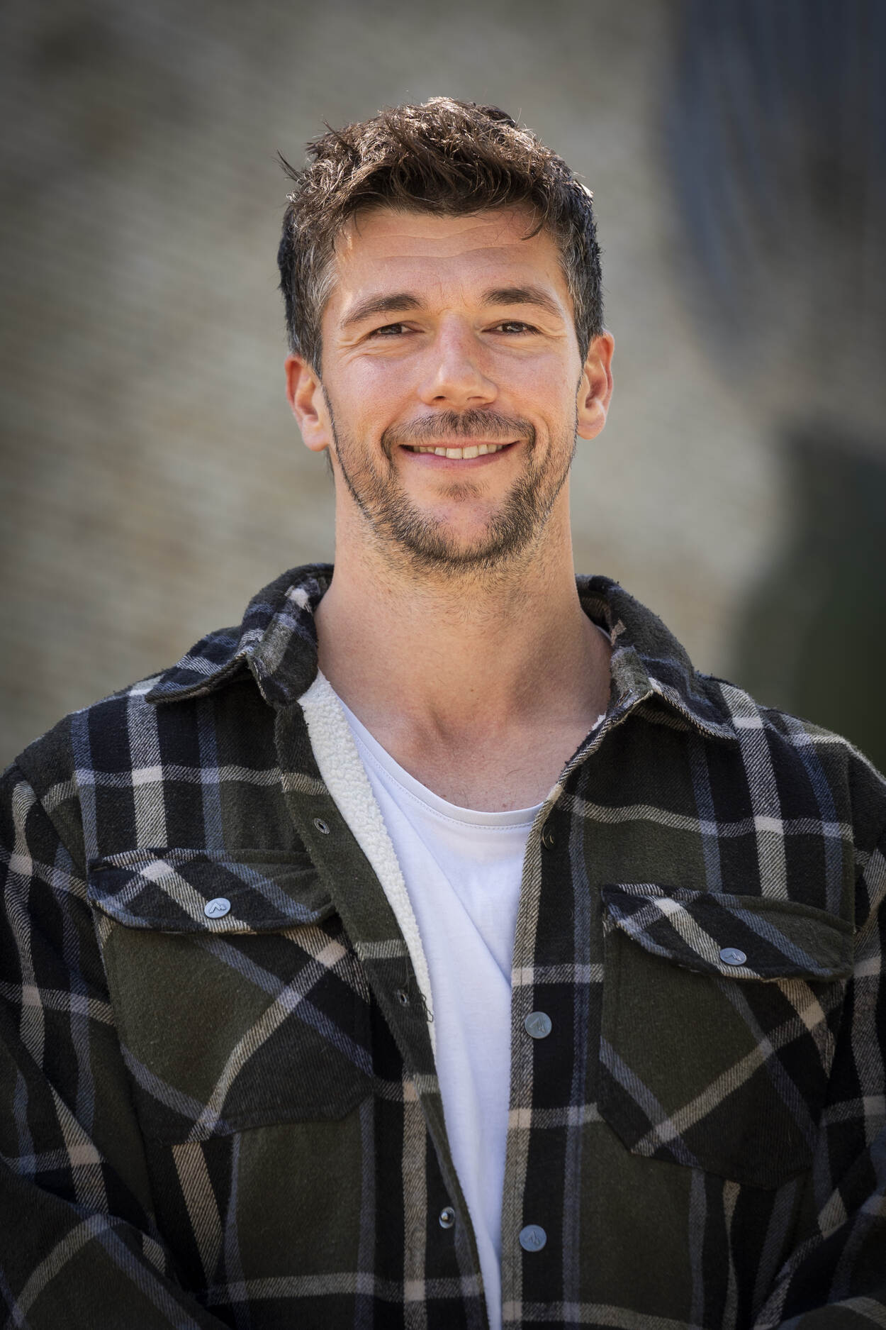 Man met stoppelbaard en geruit hemd kijkt lachend in de camera.