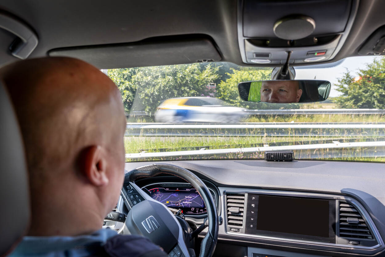 Marechaussee kijkt door de achteruitkijkspiegel van zijn auto.
