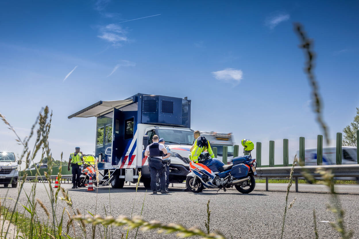 Marechaussees op de controlestrook langs de snelweg.