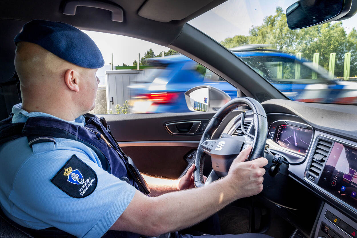 Marechaussee bekijkt het verkeer vanuit zijn auto.
