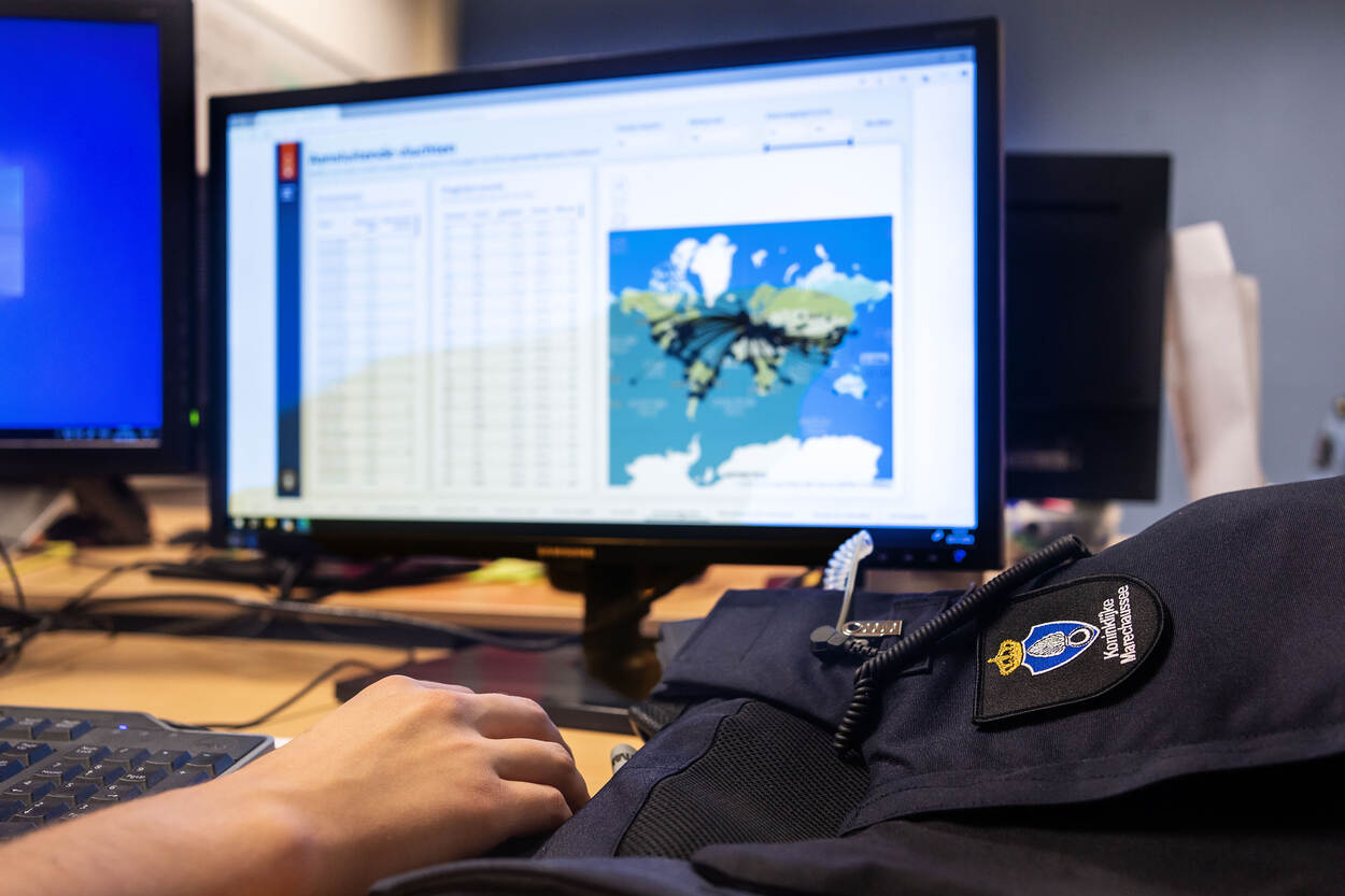 Toetsenbord, marechaussee-outfit, hand en computerscherm.