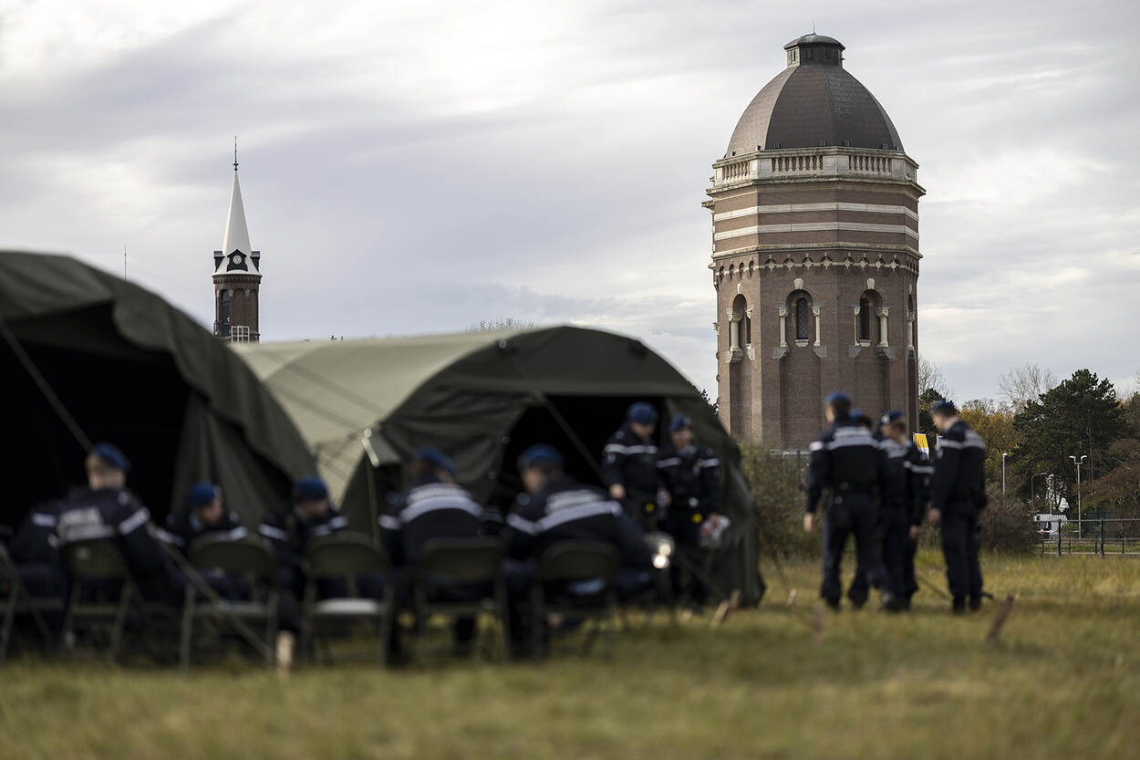 Een groep marechaussees voor de boogtenten waar de bivak plaatsvindt.