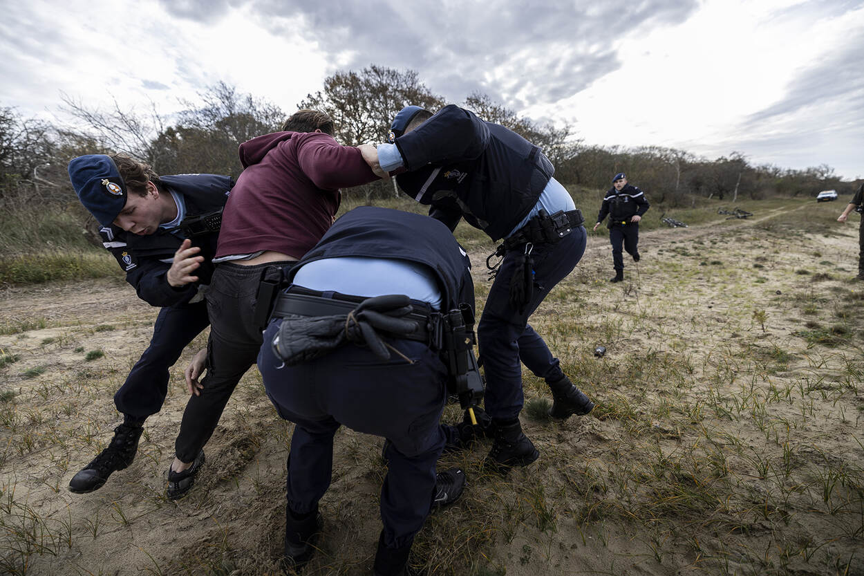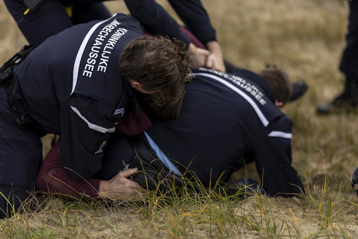 Een marechaussee houdt een geknield persoon tegen een hekwerk aan.