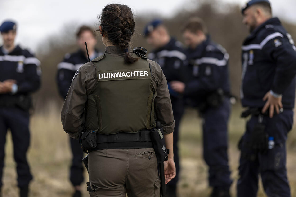 Een groep marechaussees wordt toegesproken door een duinwachter.
