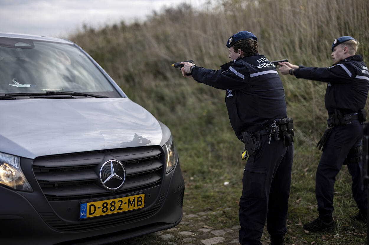 Twee marechaussees trekken hun wapen om een auto te stoppen