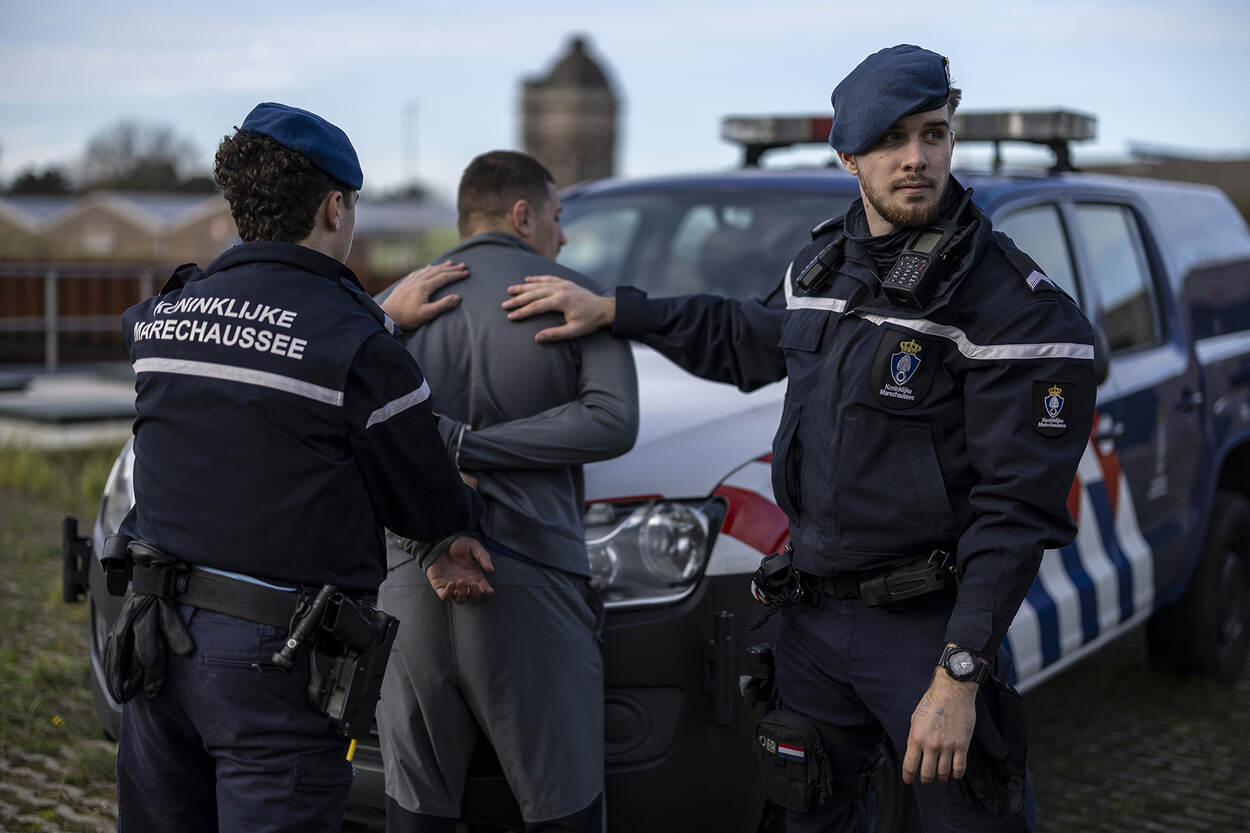 Marechaussees houden een verdachte aan en houden hem geboeid tegen de auto.