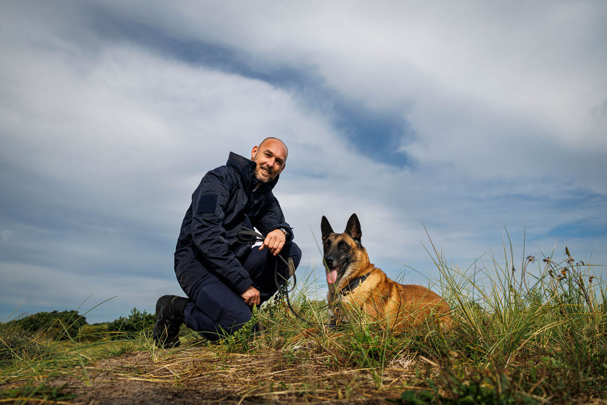 Marechaussee gehurkt met liggende Mechelse herder in de duinen.