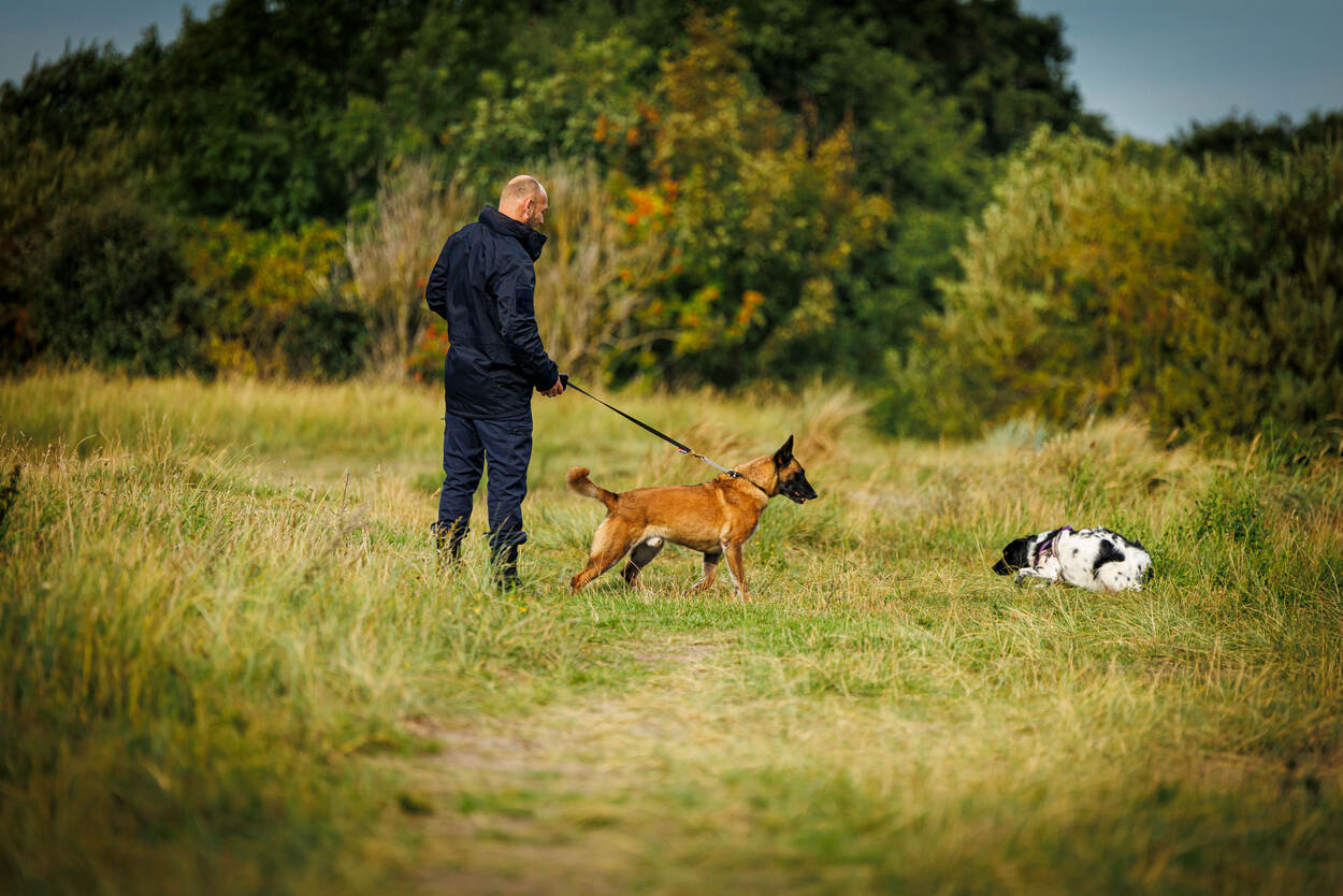 Door marechaussee aangelijnde Mechelse herder loopt in duinen richting een andere hond.