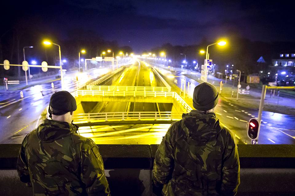 Collega’s van 20 Nationale Reservebataljon en 11 Luchtmobiele Brigade staan op steenworp afstand van Heinens Fennek. Het kruispunt waar de militairen op uitkijken, is tijdens de NSS volledig afgesloten met 20 ton zware vrachtwagens als roadblocks. “We speuren met verrekijkers de omgeving af om te kijken of alles veilig is. Zo nu en dan laten we een stadsbus door. Verder passeert hier niemand zonder ons medeweten”, garandeert een luchtmobieler.